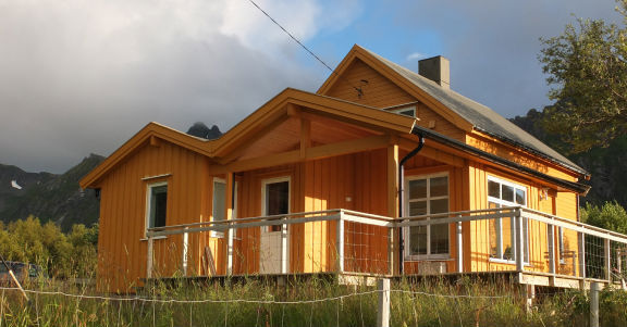 Das alte, kleine, fast quadratische, zweigeschossige Holzhaus, eine so genannte Hütte, wie sie jeder Nordnorweger hat, ist im Erdgeschoss um ungefähr die gleiche Grundfläche erweitert worden. Die Erweiterung bietet der größer gewordenen Familie mehr und besser nutzbare Wohnfläche.